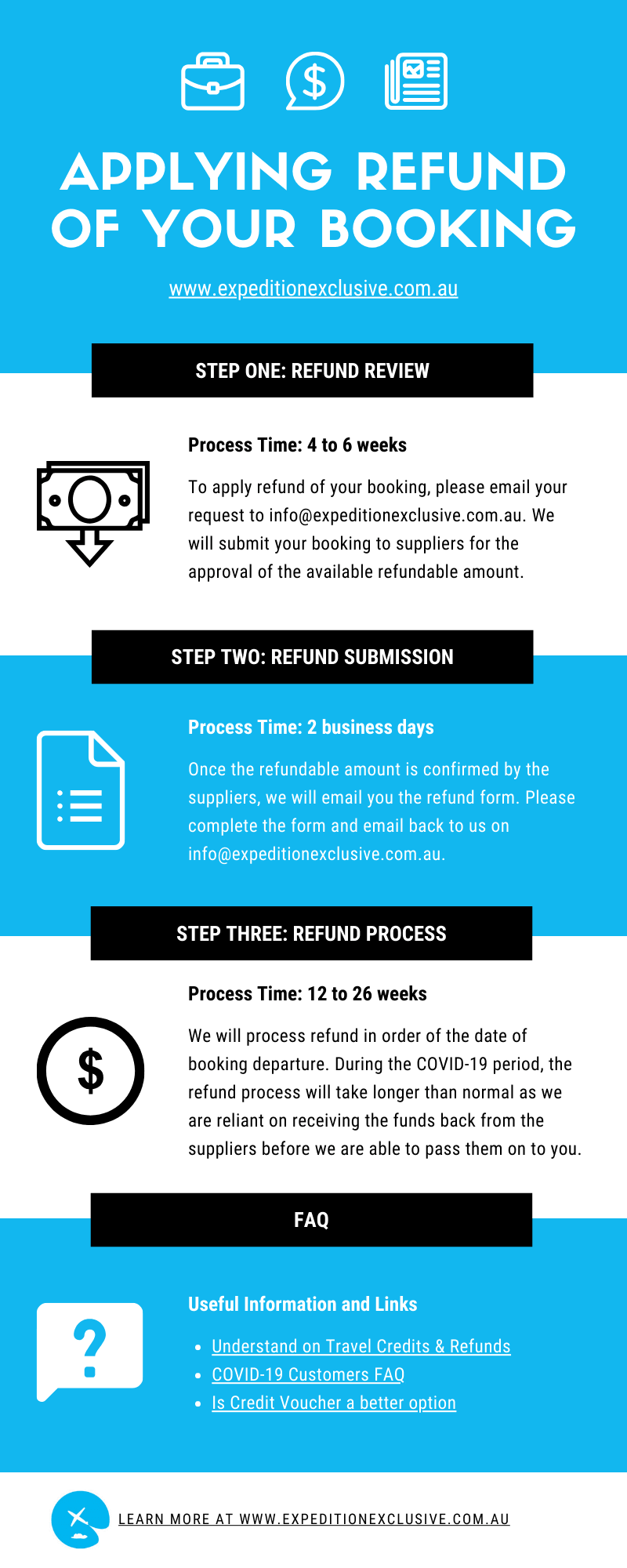 To request a refund for your booking, please email your request to info@expeditionexclusive.com.au and we will review your case in line with the standard Booking Terms and Conditions.